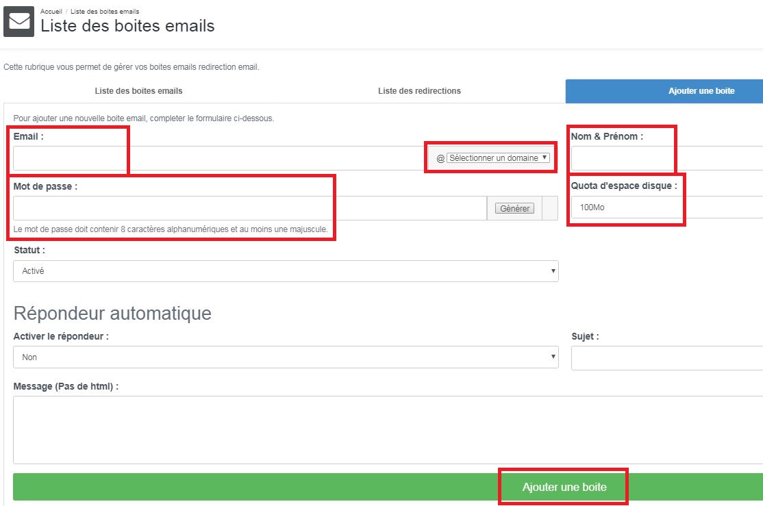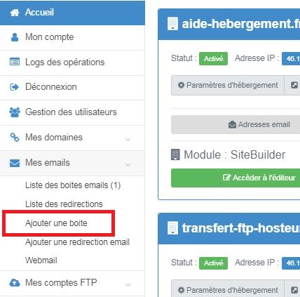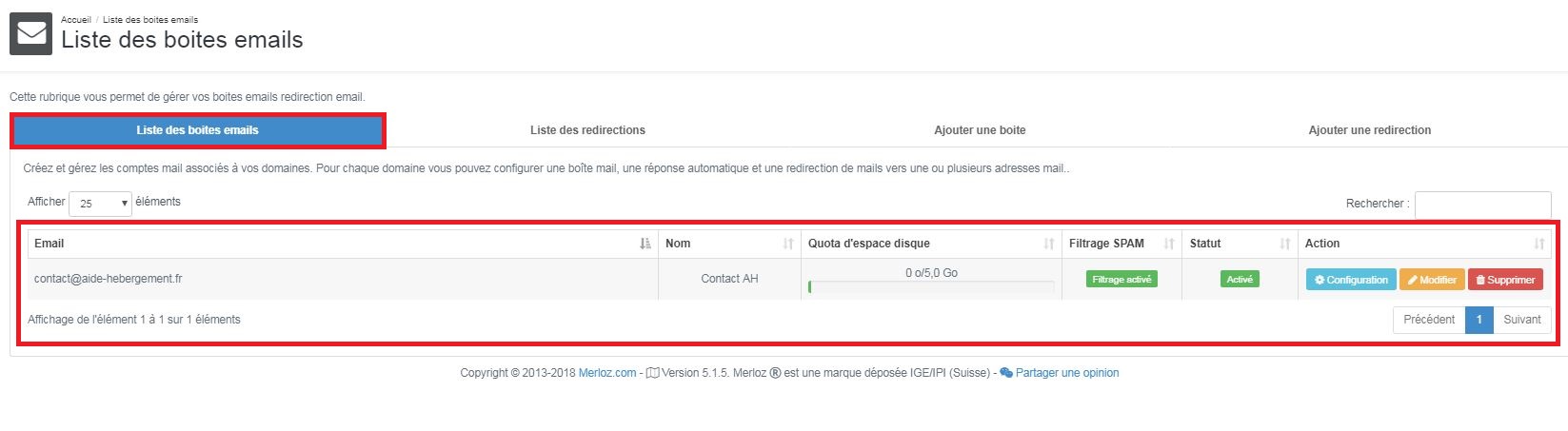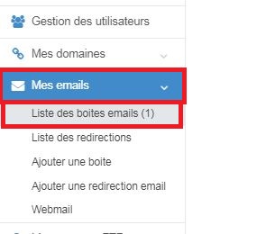 Cliquez sur "Liste des emails" ou "Gestion des boîtes mails", la liste des adresses mails créées apparaît alors à l'écran.