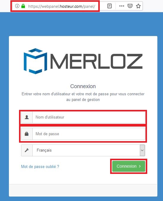 Pour vous connecter à votre panel de gestion, connectez vous à votre espace client, allez dans la rubrique "Hébergement" et cliquez sur l'hébergement concerné. Vous verrez ensuite apparaître vos identifiants de connexion au panel ainsi qu'un lien : "Merloz : Connexion à votre panel de gestion".