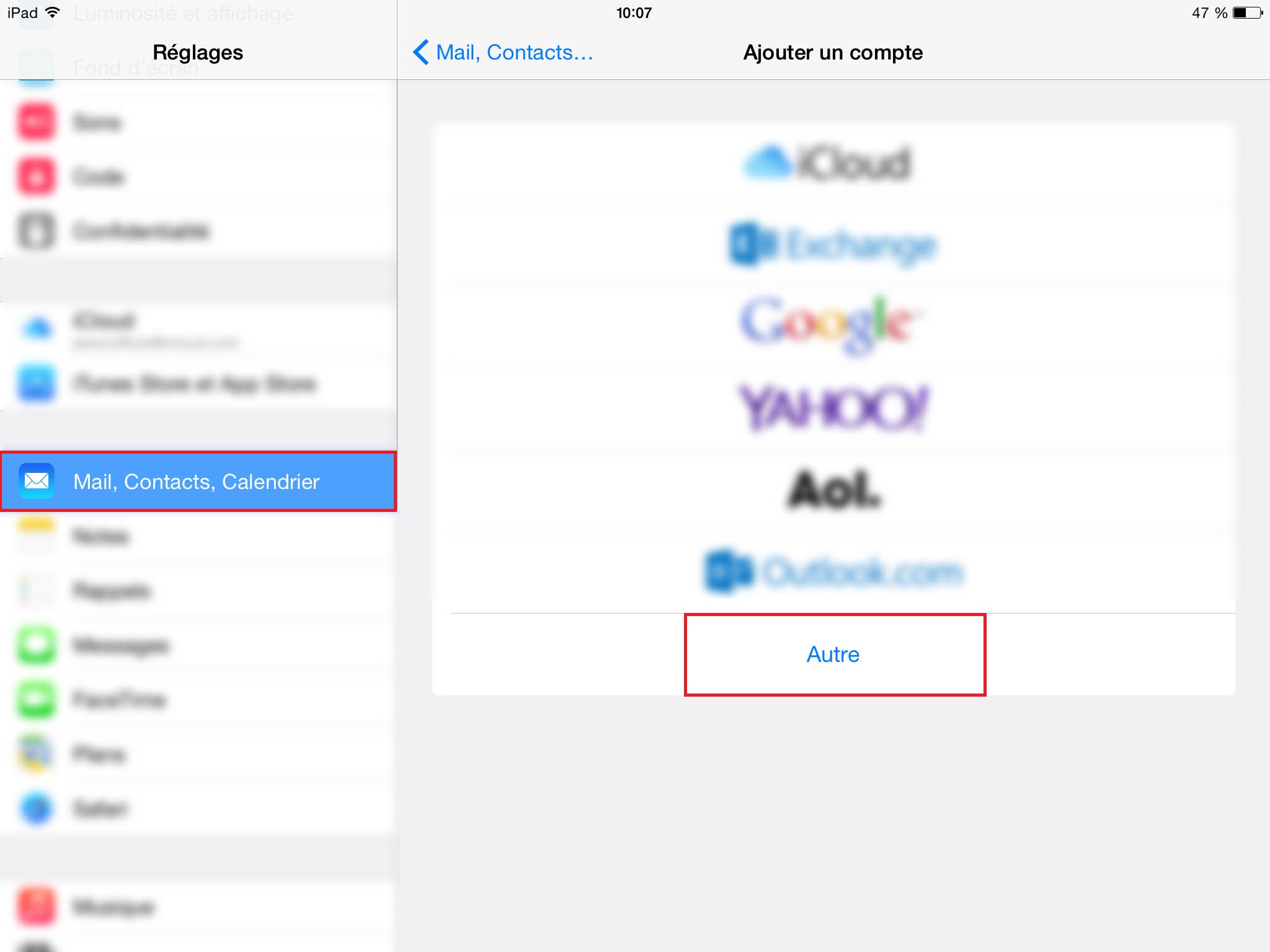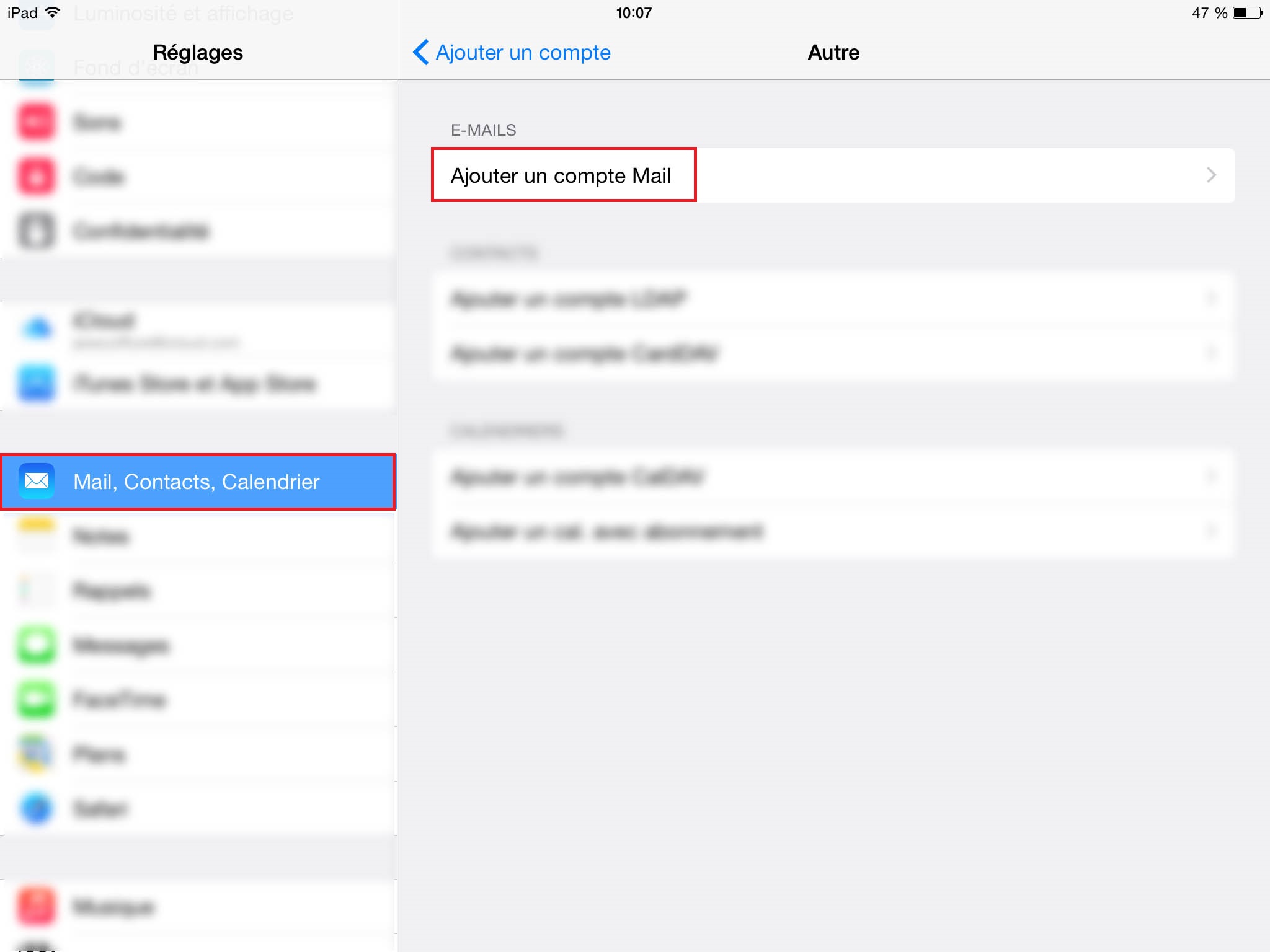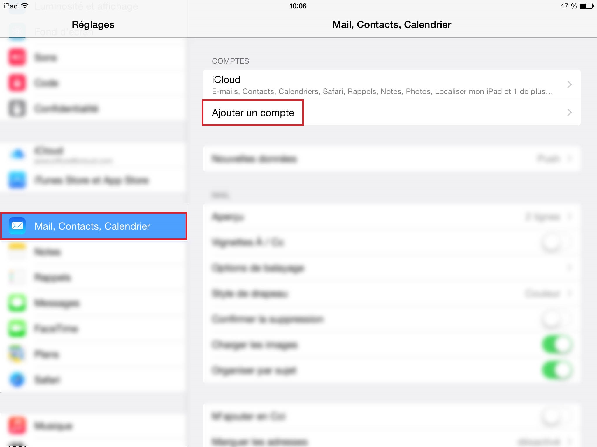 1- Allez dans les paramètres, puis "Mail, Contact, Calendrier", cliquez sur "Ajouter un compte" :