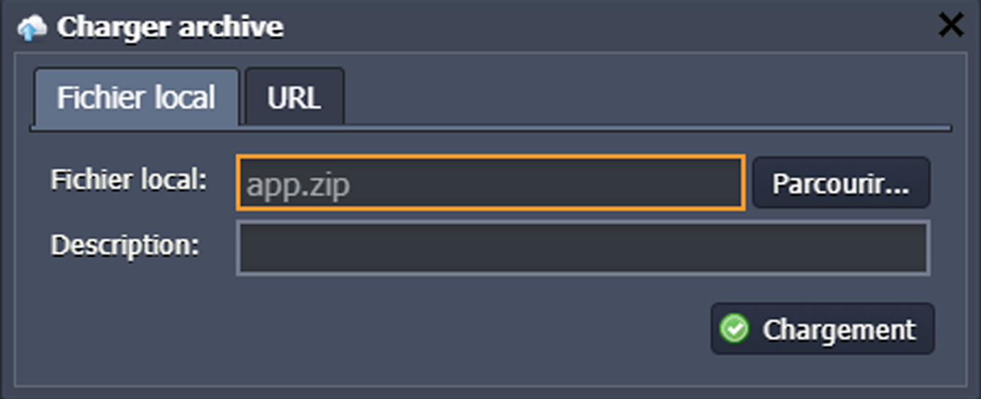Remarque : La taille maximale de l'archive pour le téléchargement de fichiers locaux est de 150 Mo. Si la taille de votre application dépasse cette limite, veuillez utiliser l'option URL.