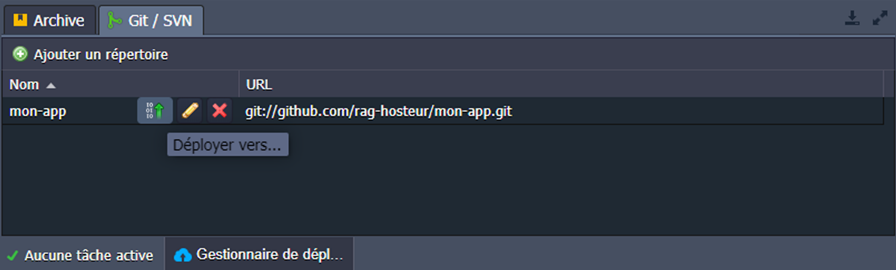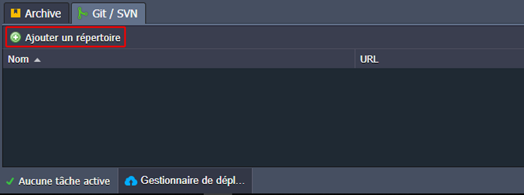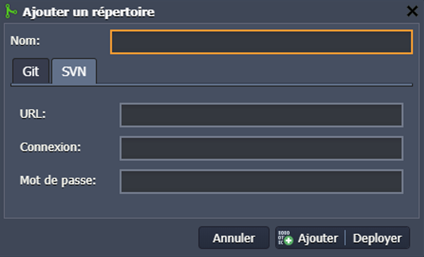 1. La section Git / SVN du Gestionnaire de déploiement stocke le lien vers le répertoire distant avec vos projets et, si nécessaire, les identifiants d'authentification appropriés.