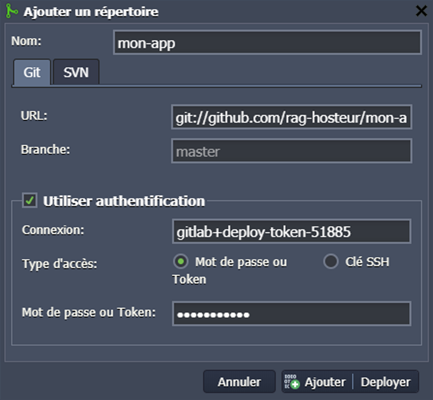 Remarque : Si votre répertoire est protégé par une authentification à deux facteurs, vous devez utiliser le jeton d'accès approprié (par exemple pour GitHub ou GitLab) au lieu de votre mot de passe.