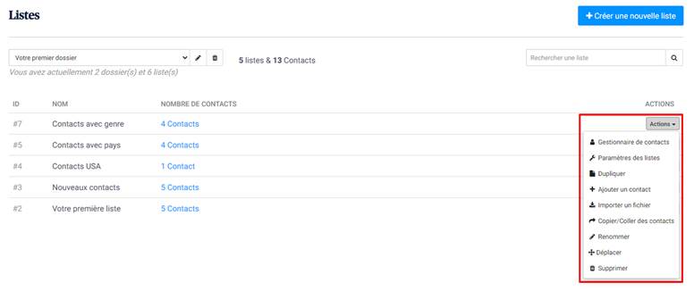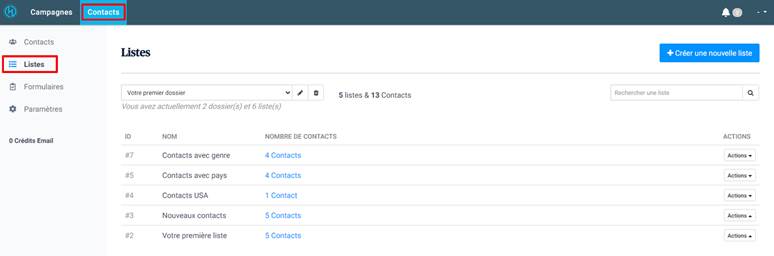 Le gestionnaire de listes vous permet de voir les listes de contacts qui sont dans vos dossiers, d’en créer de nouveaux, d’en supprimer…