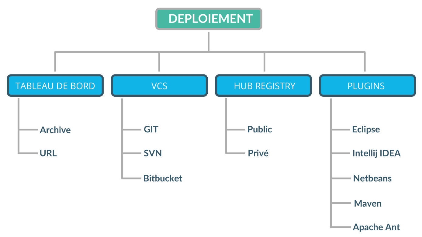 • Plugins : déploie un projet en utilisant l'un des outils de développement logiciel les plus populaires (Ant Task, Eclipse, Intellij IDEA, Maven ou NetBeans), qui permet l'intégration avec la plateforme