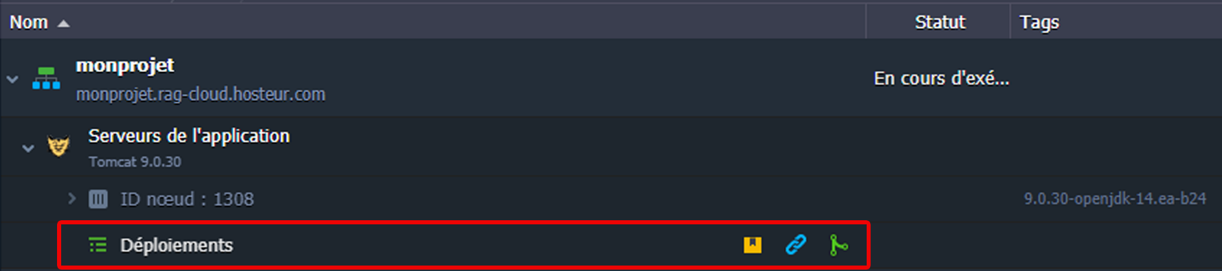Dans ce guide nous décrirons le déploiement via l'archive et le référentiel VCS. Ils peuvent être appelés soit à partir du Gestionnaire de Déploiement, soit en survolant l'enregistrement Déploiements, qui est fourni pour tous les serveurs d'application, et en cliquant sur l'un des boutons appropriés.