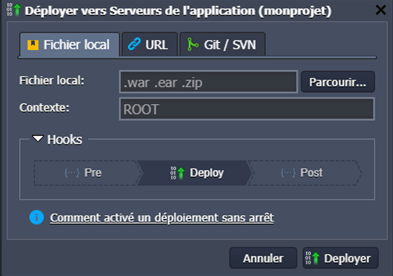 • Tableau de bord : correspond au déploiement via l'archive (fournie soit comme fichier local soit comme URL)