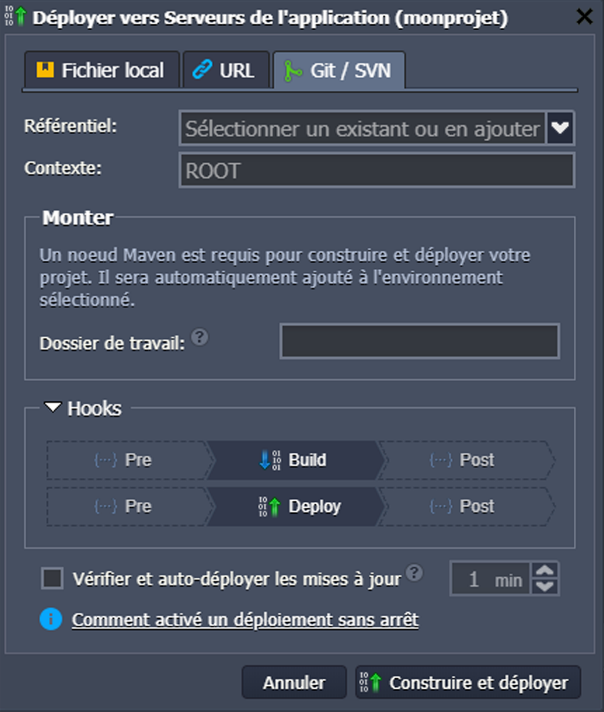 • Référentiel : permet de sélectionner le projet Git / SVN à partir du Gestionnaire de Déploiement (ou de passer à son formulaire d'ajout)