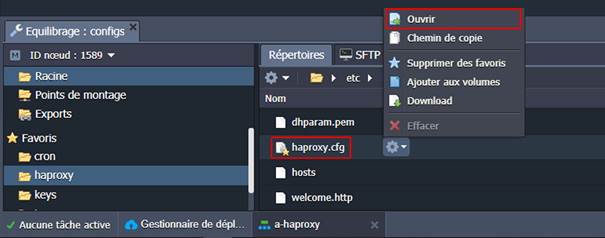 En outre, vous pouvez spécifier quelques paramètres supplémentaires par le biais du tableau de bord RAGNARØKKR en éditant le fichier de configuration principal (cliquez sur Réglages à côté du nœud HAProxy puis allez dans haproxy.cfg ou haproxy > haproxy.cfg)