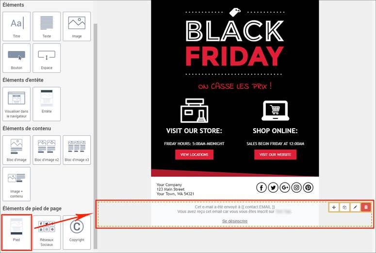 L’élément de pied de page « Pied » contient un lien de désinscription. Il vous suffit de faire un glisser-déposer.