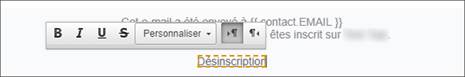Remarque : vous pouvez modifier les textes, mais vous devez garder la partie « {EMAIL} » telle quelle. Elle sera automatiquement remplacée par l’adresse email du contact lorsque ce dernier cliquera sur le lien de désinscription. Même si vous supprimez ou changez le texte {EMAIL}, l’adresse email s’affichera toujours.