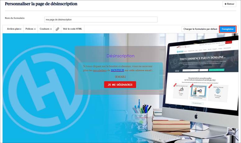 Dans l’éditeur, donnez un nom à votre page de désinscription et effectuez vos modifications. Vous pourrez ainsi ajouter une image de fond, jouer sur les couleurs de fond du conteneur, du bouton et des textes, changer les polices, insérer des liens…