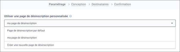 A l’étape de Paramétrage de la création d’une campagne email, vous pouvez sélectionner une page de désinscription parmi celles que vous avez créées, ou garder celle définie par défaut.