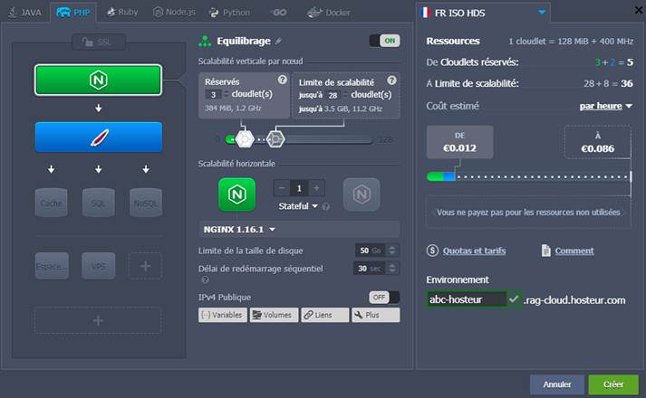 3. Créez l'environnement avec quelques serveurs d'application et NGINX comme équilibreur, spécifiez les limites du cloudlet, tapez le nom de l'environnement et cliquez sur le bouton Créer.