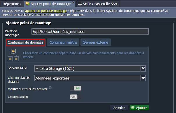 Conseil : si vous devez monter des données à partir d'un conteneur qui est exécuté dans une autre installation RAGNARØKKR, vous devez le configurer au préalable comme un serveur NFS externe.
