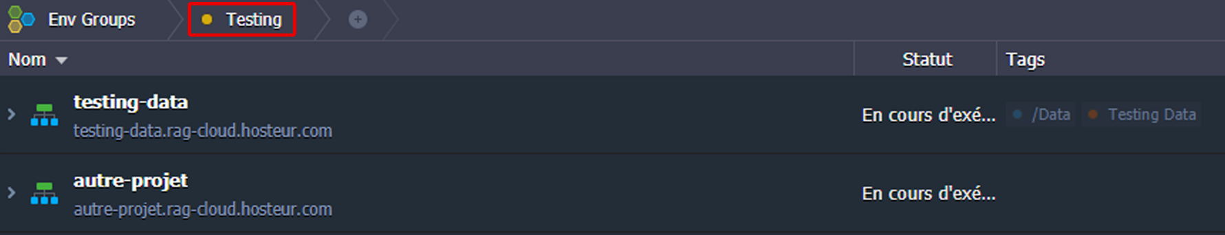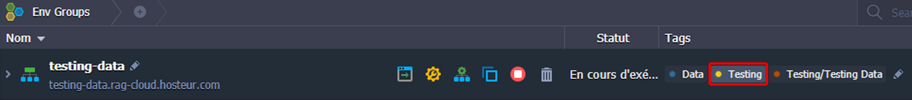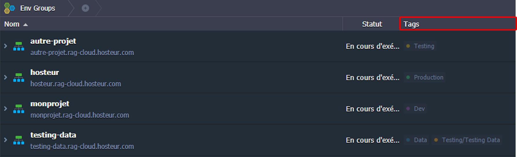 La colonne Tags liste tous les groupes auxquels un environnement appartient : cliquez sur une étiquette particulière afin de vous référer au groupe approprié.