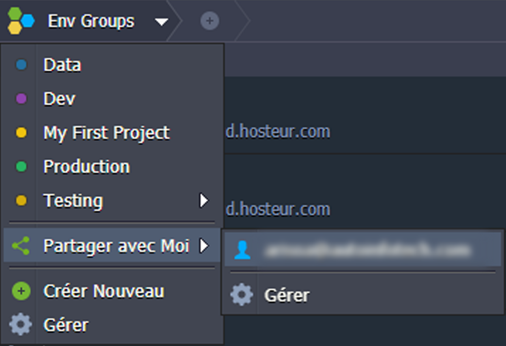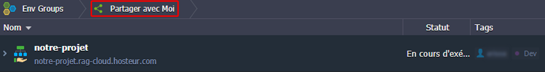 Remarque : Lorsque vous survolez l'option Partager avec moi, vous verrez la liste des propriétaires de collaboration auxquels vous appartenez ; en choisissant un enregistrement particulier, vous verrez les environnements qui vous ont été partagés par cette personne.