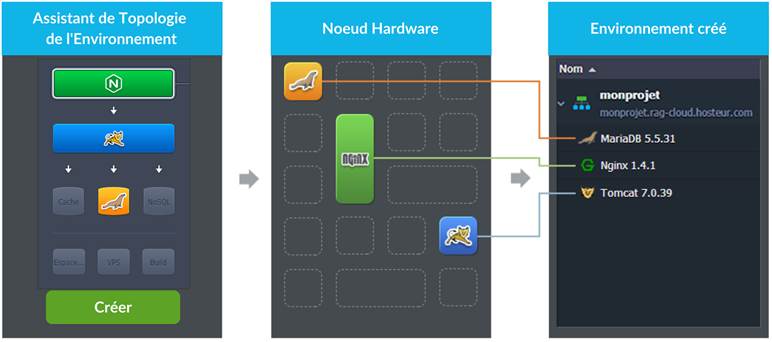 Chaque environnement est un ensemble de conteneurs virtuels isolés qui fournissent toutes les installations nécessaires à une application particulière. Lors de la création de l'environnement, les conteneurs demandés sont pris dans le groupe de modèles de conteneurs pré-créés. Cela permet d'accélérer l'approvisionnement et signifie qu'il faut littéralement une minute pour mettre en place des environnements complexes. Chaque pile est située à l'intérieur du conteneur isolé, ce qui élimine le risque d'influence potentielle d'une pile sur une autre.