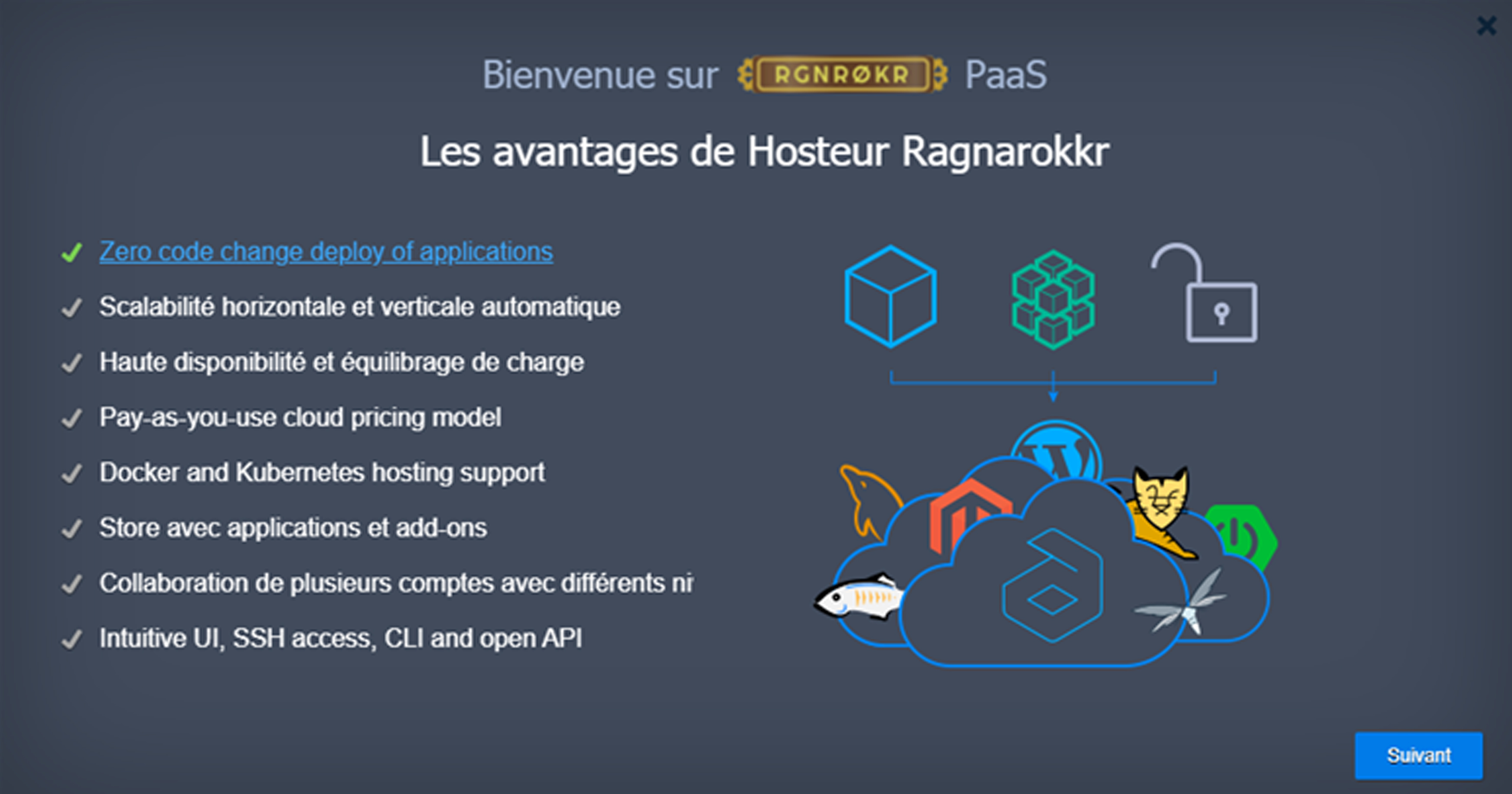 Dès la première connexion au tableau de bord, RAGNARØKKR PaaS lance automatiquement un guide d'introduction rapide. Le tutoriel comprend des informations sur les principales fonctionnalités et caractéristiques disponibles pour vous et vous aide à déployer votre première application. L'ensemble du processus ne prend que quelques minutes et constitue une excellente base pour commencer à travailler avec la plateforme.