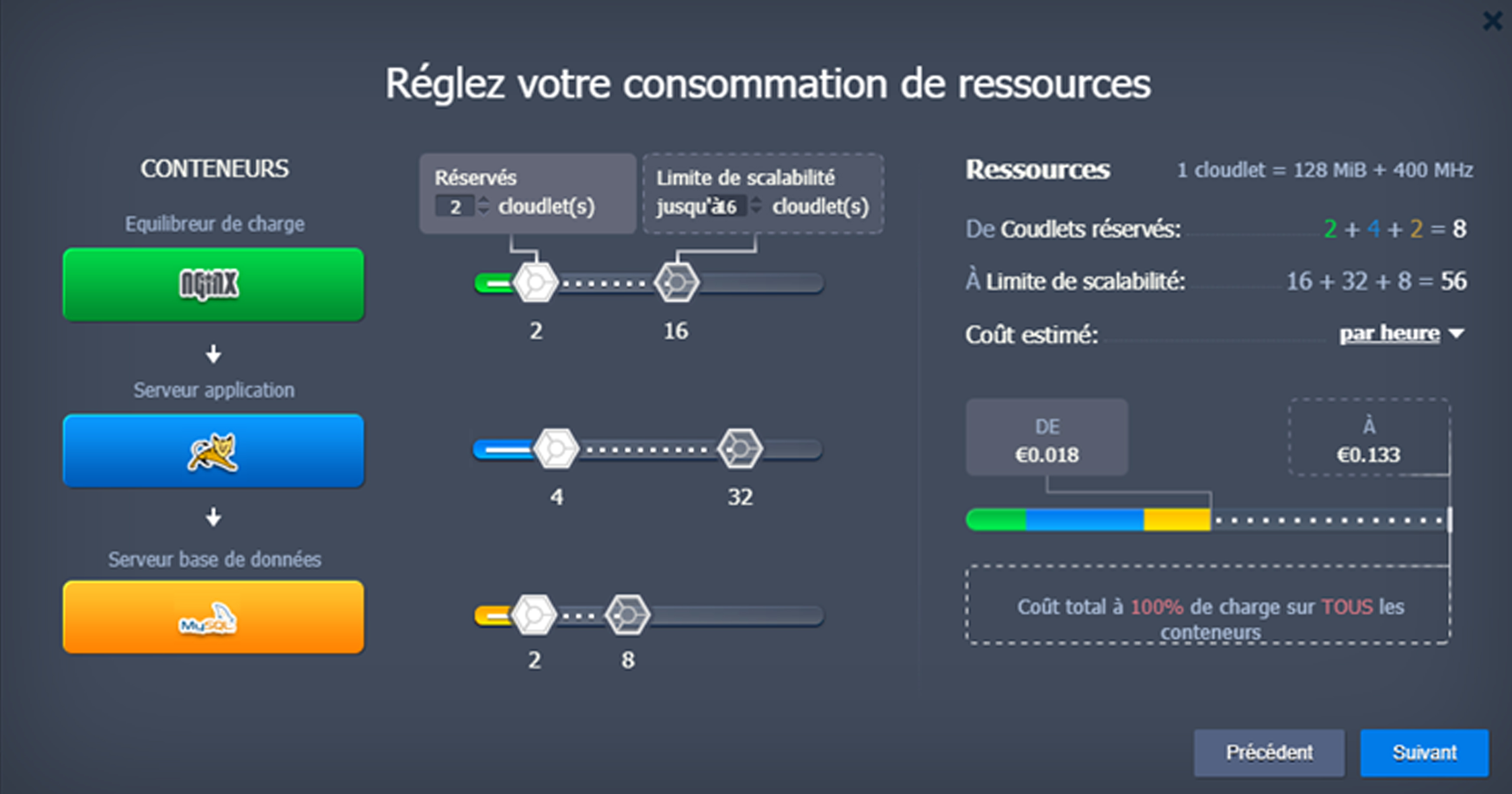 3.Le prochain cadre Réglez votre consommation de ressources montre comment fournir des ressources aux instances et comment le prix estimé est automatiquement calculé.