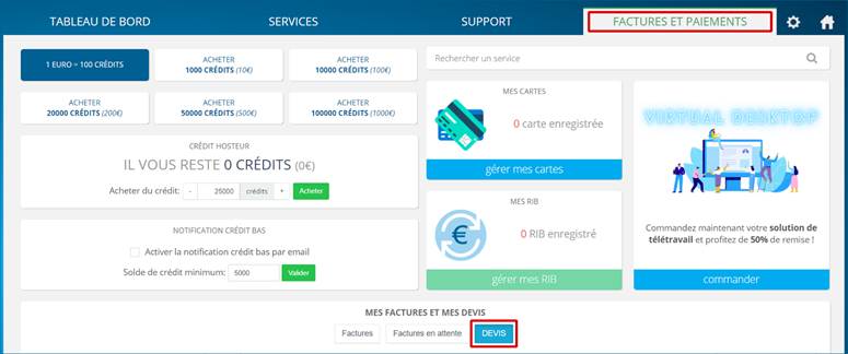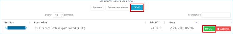 - En nous demandant un devis (vous pouvez pour cela contacter notre support technique), que vous pourrez par la suite voir dans votre Espace Client >> Factures et paiements >> Devis. Il ne vous restera plus qu’à cliquer sur le bouton Payer.