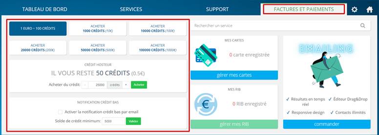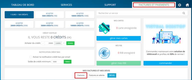 Vous pouvez acheter des crédits Hosteur depuis votre Espace Client >> Factures et paiements.