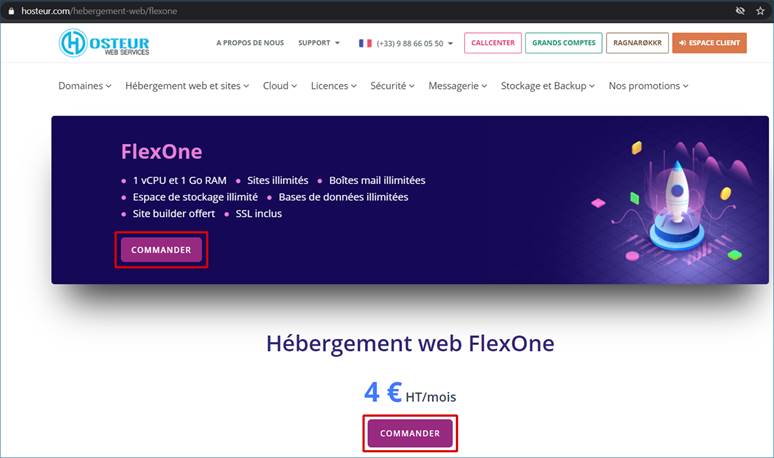 - Via notre site https://www.hosteur.com/ en allant sur l’offre qui vous intéresse, et de cliquer sur le bouton Commander. Il vous suffira ensuite de suivre les démarches jusqu’au paiement ;