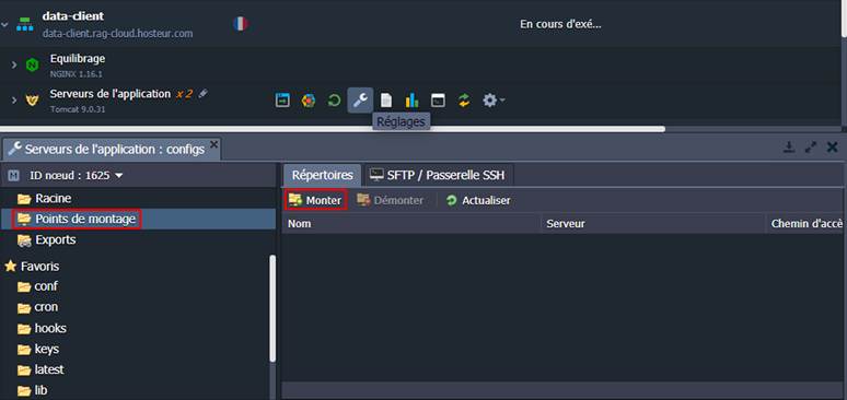 Ainsi, pour monter des données sur un conteneur, cliquez sur le bouton Réglages à côté du conteneur ou de la couche choisie. Dans l'onglet Configs ouvert, passez à la section Points de montage dans le menu de gauche :