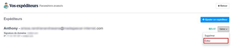 2. Cliquez sur Gérer > Editer à côté de l’expéditeur dont vous souhaitez créer un pool d’IP.
