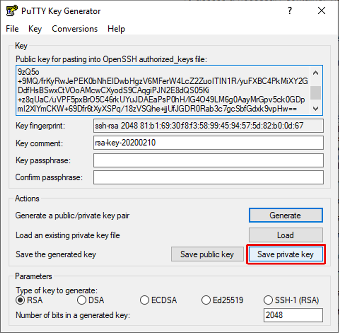 Si vous êtes un utilisateur de Windows, vous devez en outre enregistrer la clé privée qui correspond à votre clé SSH publique (nous utilisons l'outil PuTTYgen à titre d'exemple) :