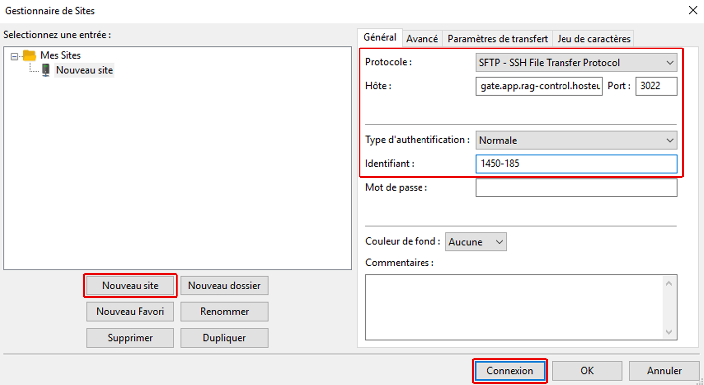 • Votre chaîne de connexion SSH : {id_utilisateur}@app.rag-control.hosteur.com:3022