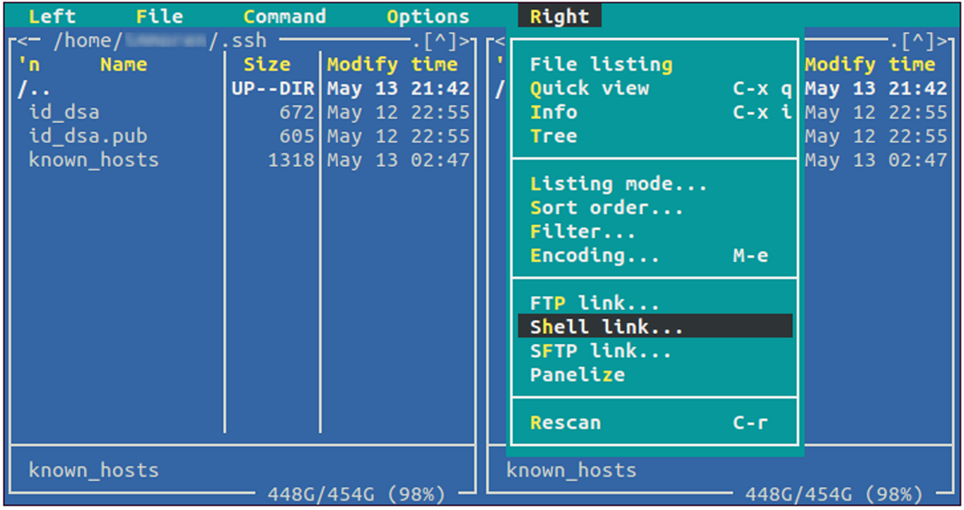 4. Sélectionnez F9 pour afficher la barre d'outils du menu. Ensuite, ouvrez le menu du panneau left ou de right et choisissez l'élément de Shell link.