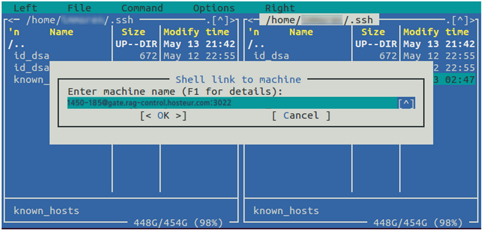 Examinons l'exemple de l'utilisation du protocole FISH en établissant une connexion sécurisée entre un conteneur distant et l'outil Midnight Commander.