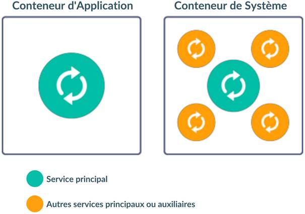 Les conteneurs de système fonctionnent avec toutes les fonctionnalités des systèmes init (systemd, SysVinit, Upstart, OpenRC, etc), ce qui permet de faire naître plusieurs processus (par exemple OpenSSH, crond ou syslogd) dans un seul conteneur sous le même système d'exploitation. Les conteneurs de système sont plus adaptés aux applications monolithiques traditionnelles ou héritées, car ils permettent de réutiliser les architectures, les outils et les configurations mis en œuvre pour les machines virtuelles.