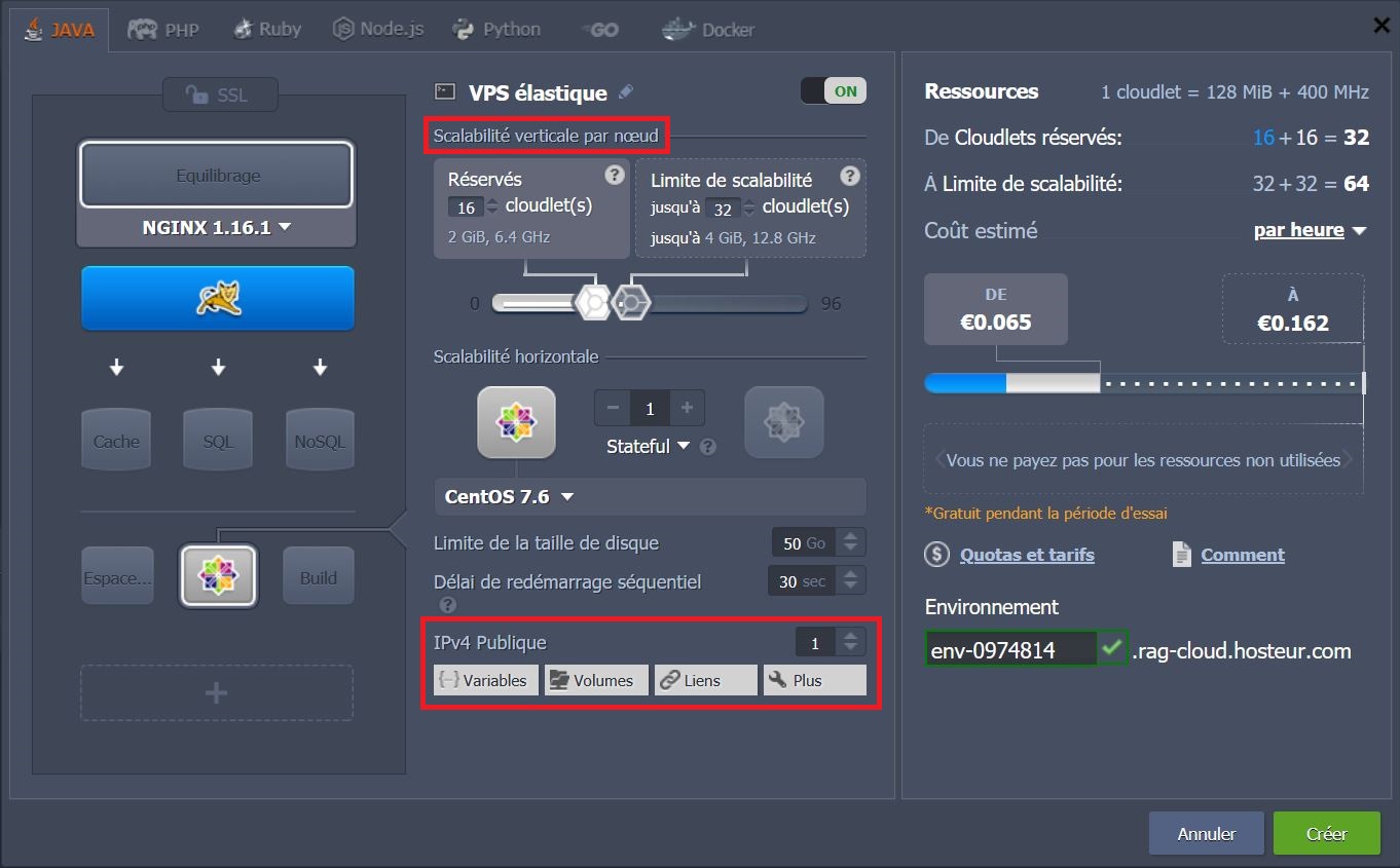 - Si vous souhaitez utiliser un Serveur Virtuel Elastique (VPS), cliquez sur l'icône du même nom, choisissez celui qui vous convient via la liste déroulante apparue (Centos 6.8, Centos 7.2, Ubuntu 16.04, Windows 2008 ou Windows 2012) et ajustez verticlement les ressources en modifiant les limites des cloudlets.