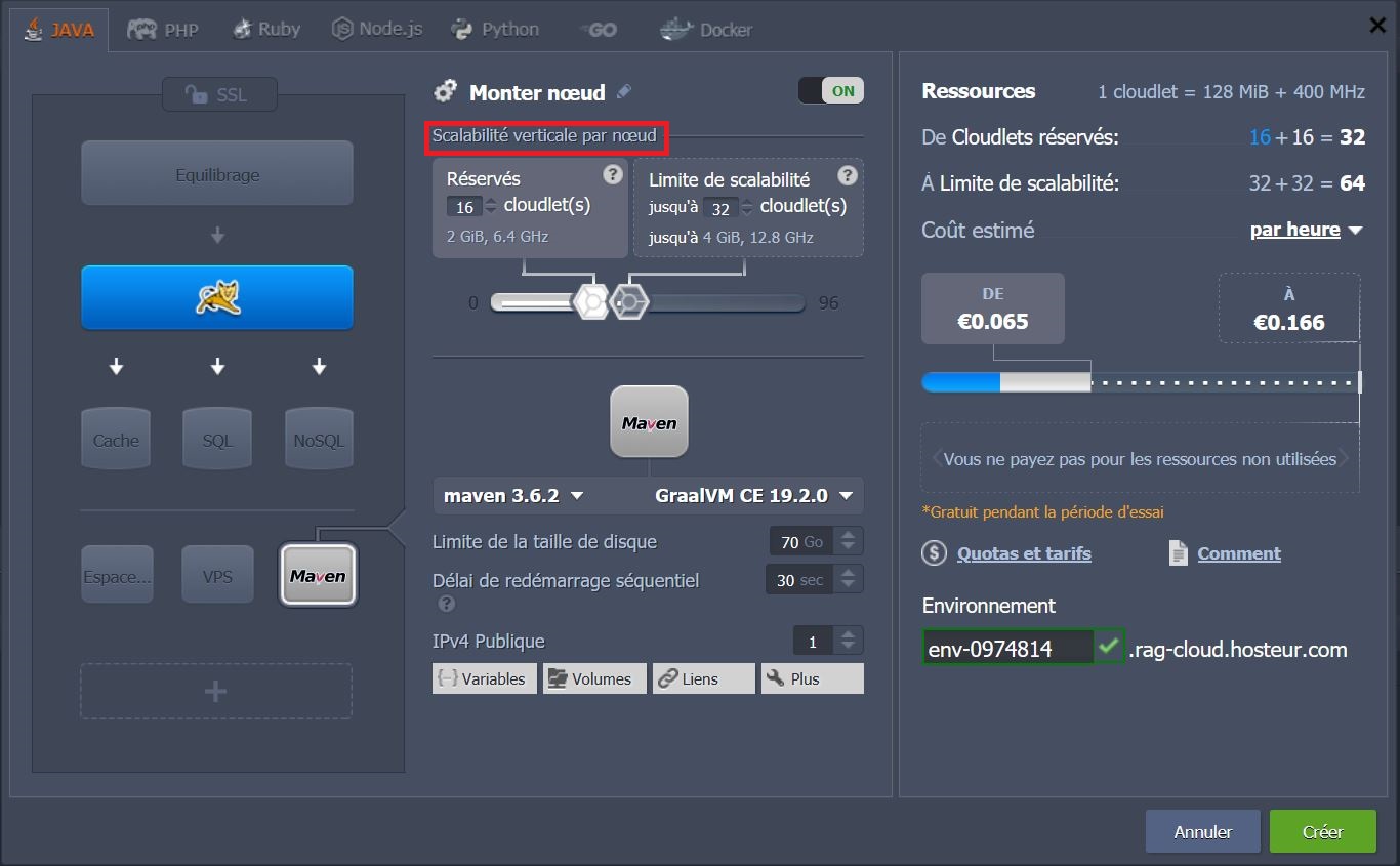 - Pour utiliser un nœud Maven (pour les projets Java), cliquez sur l'icône et spécifiez les limites du cloudlet pour son ajustement vertical en utilisant les curseurs.