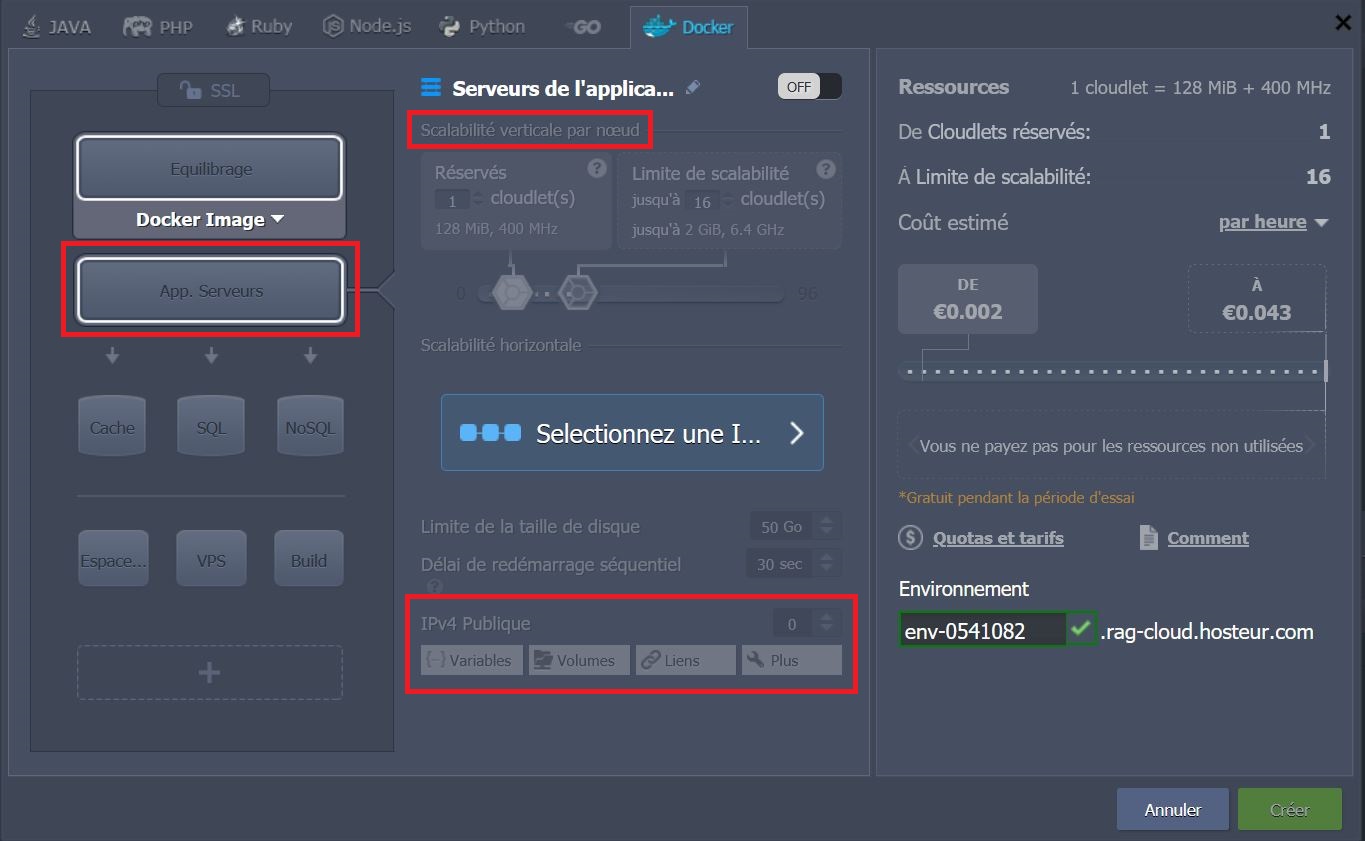 Une fois que l'emplacement d'un template particulier est choisi (en bas du cadre), vous pouvez spécifier les limites de ressources en utilisant les curseurs de cloudlets, attacher l'adresse IPv4 publique (note : ceci est une option payante) ou effectuer quelques configurations de base du conteneur via un outil graphique séparé (bouton Edit).