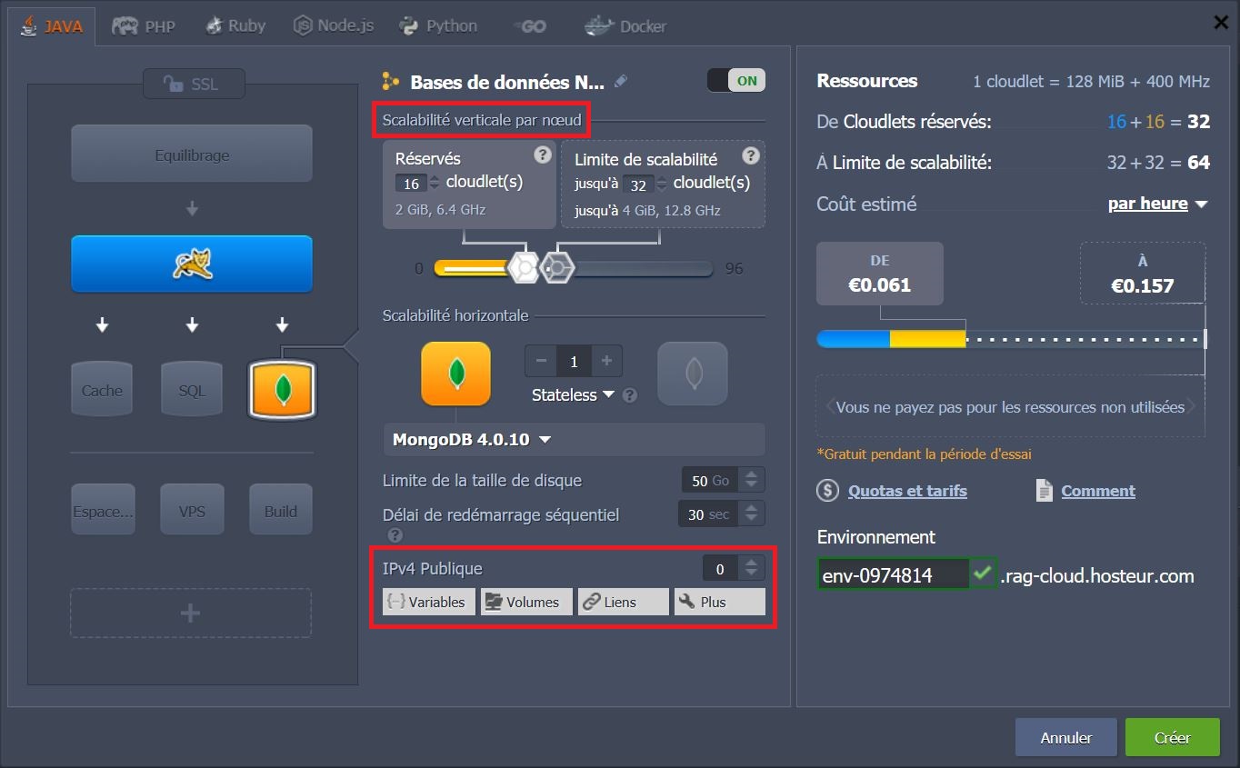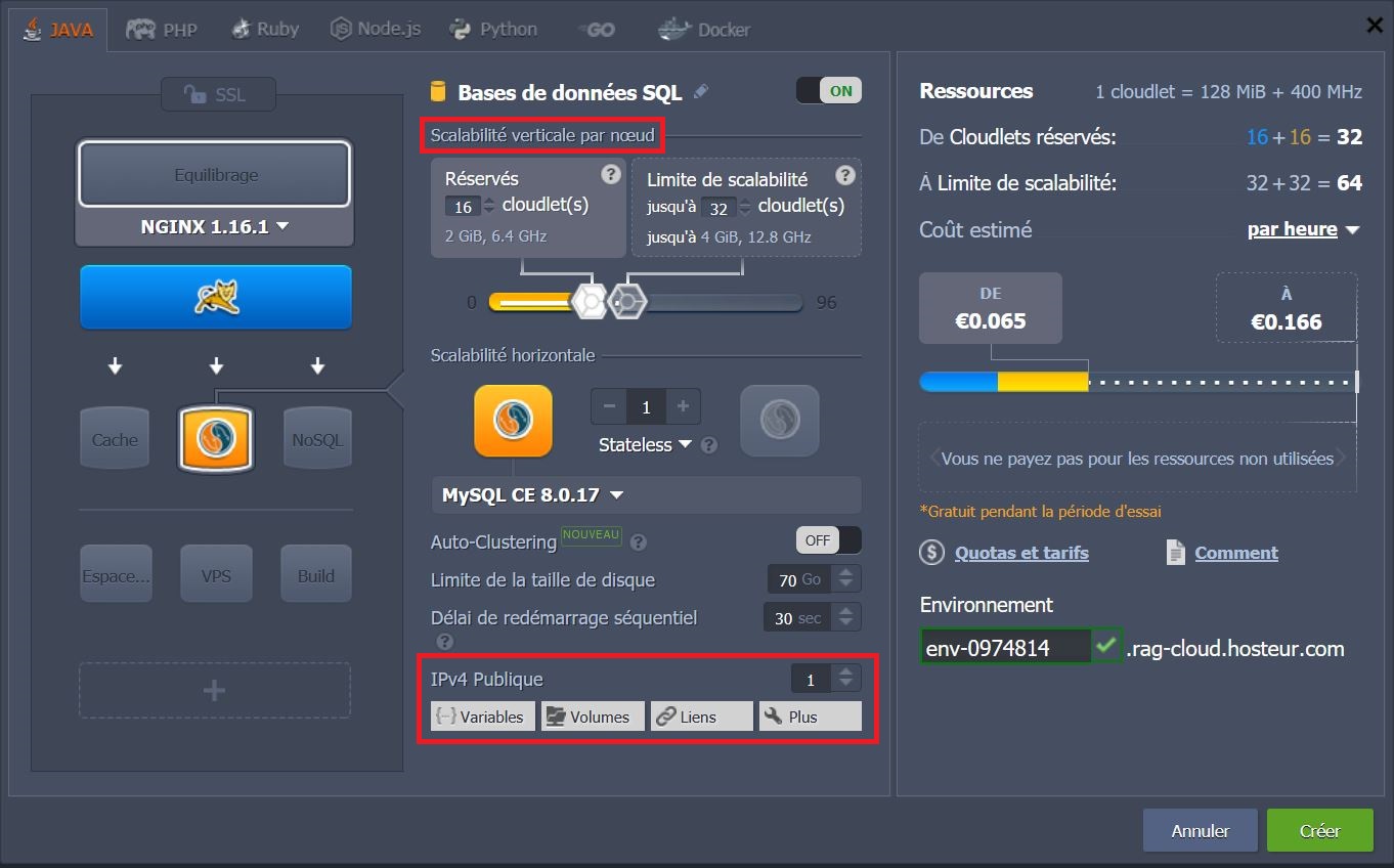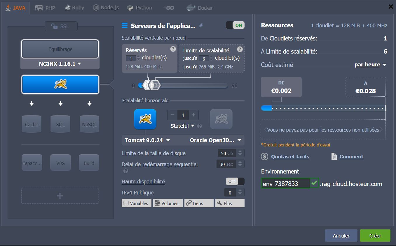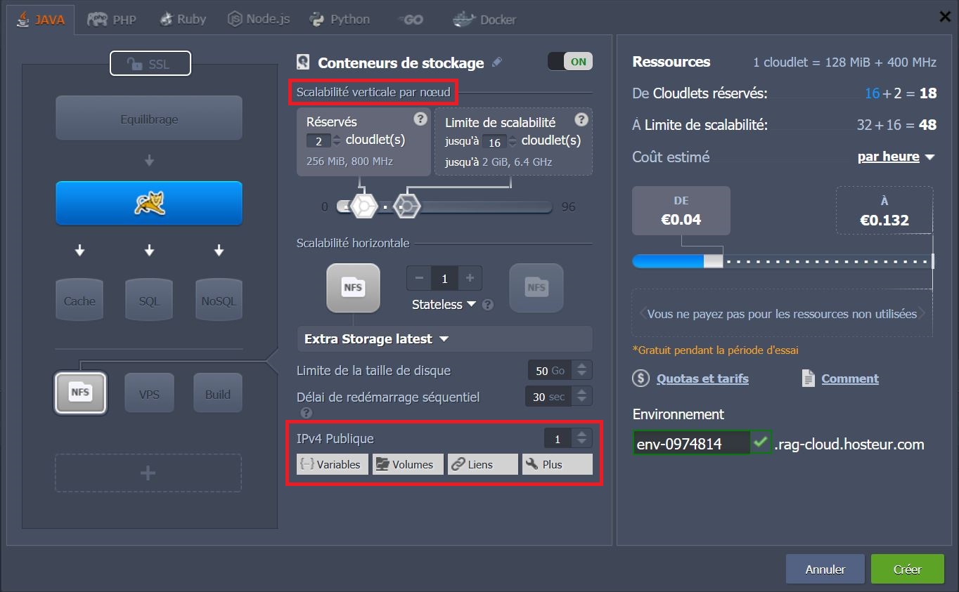 Il y a quelques options supplémentaires disponibles : Stockage, VPS, Maven et SSL.