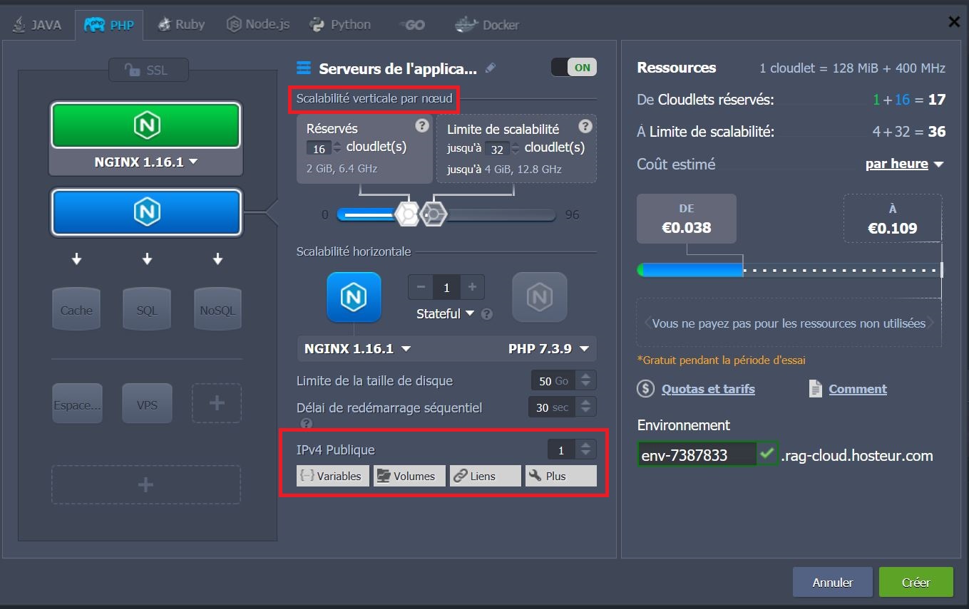 Spécifiez ensuite les limites des cloudlets à l'aide des curseurs. Si vous avez besoin d'une adresse IP publique, activez l'option IPv4 Publique (remarque : il s'agit d'un add-on payant).