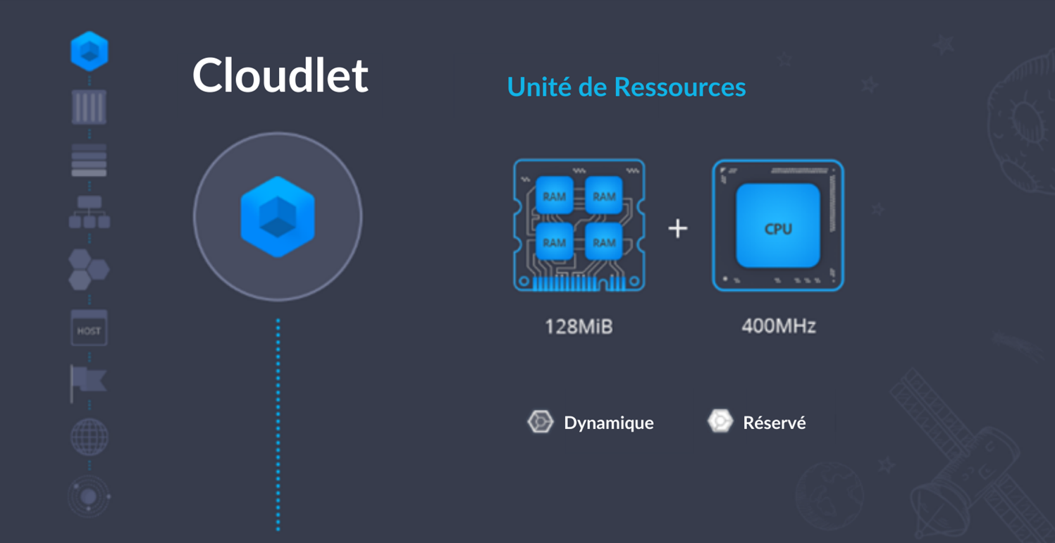 Le Cloudlet est le plus petit composant de l’infrastructure de RAGNARØKKR. C'est une unité de ressources spéciales qui équivaut à 128 MiB de RAM et 400 MHz de puissance CPU simultanément. Une telle granularité des ressources permet au système d'allouer la capacité exactement requise pour chaque instance dans l'environnement. Cela permet de garantir une tarification basée sur l'utilisation réellement équitable, de sorte que seules les ressources réellement consommées sont payées.