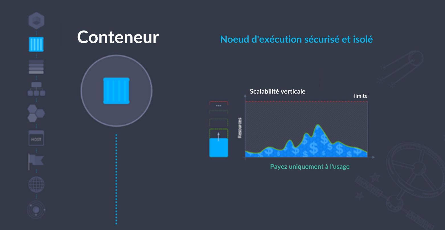 Le conteneur (nœud) est une instance virtualisée isolée, prévue pour la manipulation de la pile logicielle (comme les serveurs d'application, les bases de données, les équilibreurs de charge, etc) et placée sur un hôte particulier. Chaque conteneur peut être automatiquement ajusté, à la fois verticalement et horizontalement, ce qui rend l'hébergement d'applications vraiment flexible.