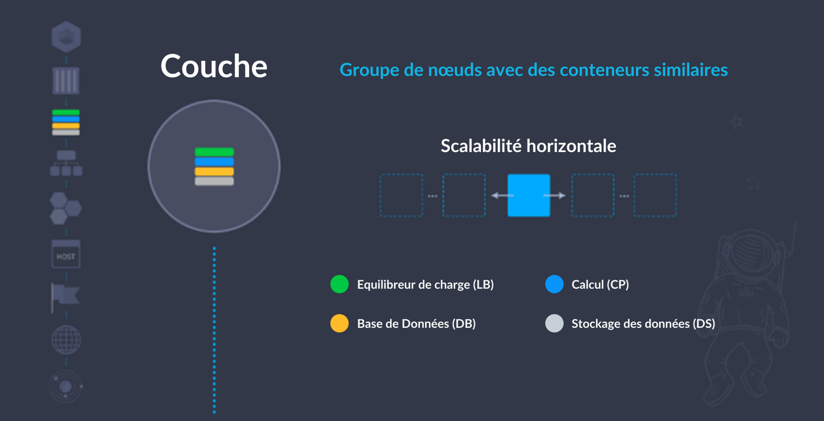 Les couches sont conçues pour effectuer différentes actions avec le même type de conteneurs à la fois. Par exemple, les nœuds peuvent être redémarrés ou redéployés simultanément, ainsi qu'être automatiquement ajustés horizontalement :