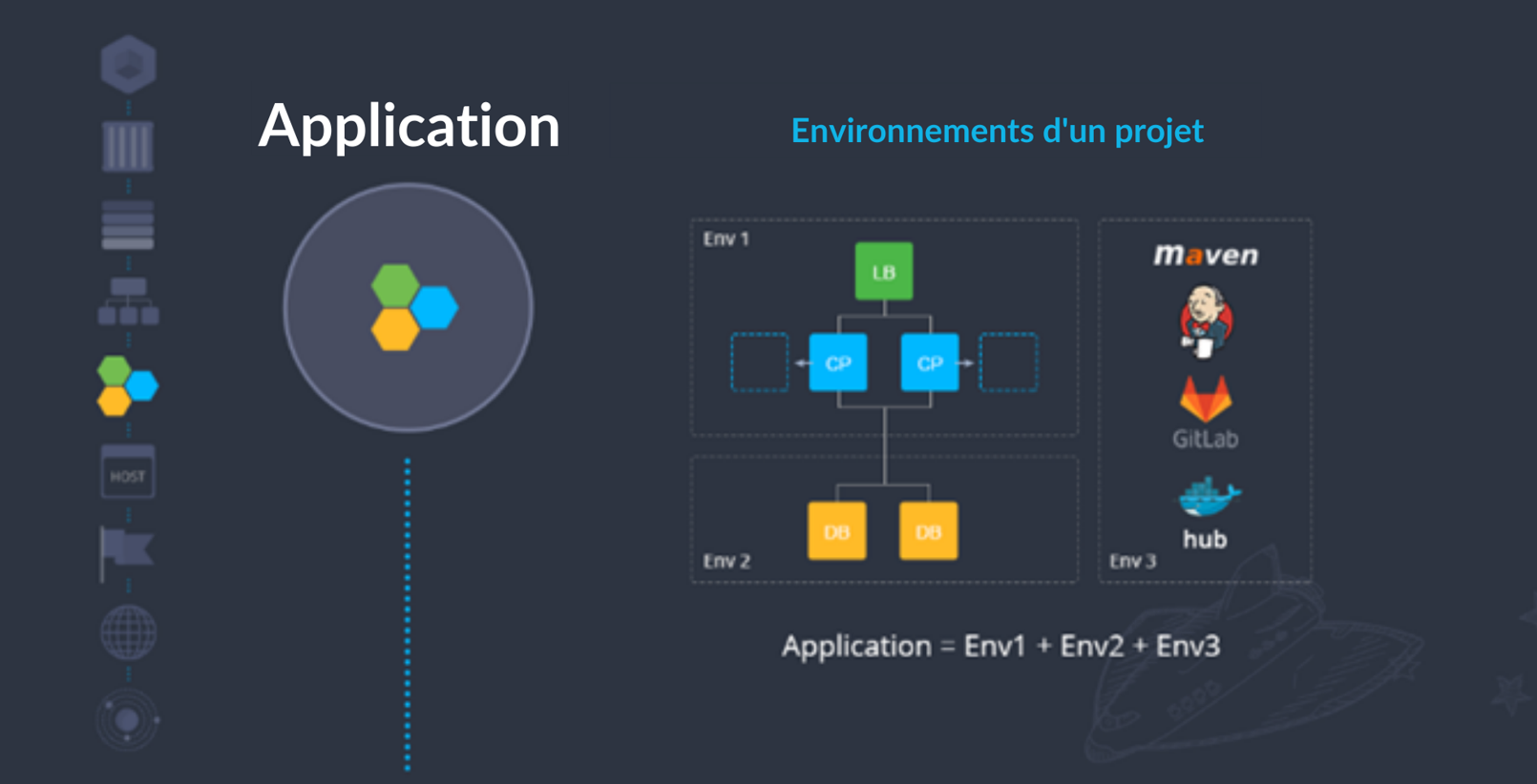 L'application est une combinaison d'environnements pour l'exécution d'un projet. Une application simple avec une ou deux piles peut être exécutée dans un seul environnement.