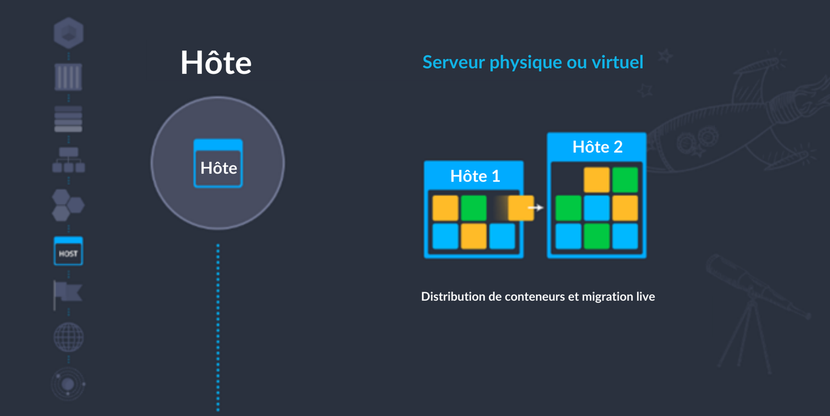 L'hôte est un serveur physique ou une grosse machine virtuelle qui est virtualisée via KVM, ESXi, Hyper-V, etc.