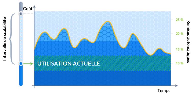La consommation des cloudlets dynamiques est calculée en fonction de votre utilisation à chaque heure. Le total de tous les cloudlets dynamiques consommés par votre environnement pendant une heure détermine votre niveau de réduction pour cette heure.