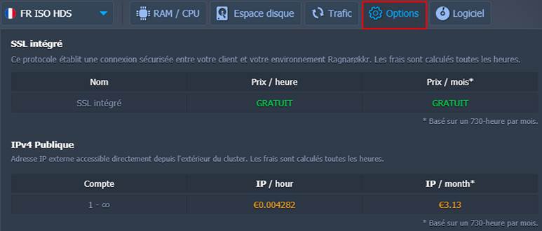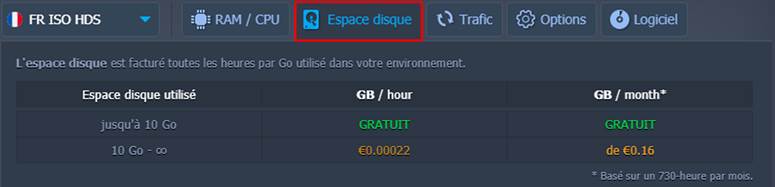 RAGNARØKKR inclut jusqu’à 10 Go d’espace disque gratuit. Au-delà de cette limite, l’espace disque que vous utiliserez vous sera facturé à l’heure et par Go supplémentaires. Par exemple si vous utilisez 12 Go d’espace disque, vous ne payerez que les 2 Go supplémentaires par heure.