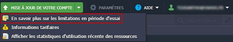 Vous pouvez consulter les limitations de votre compte d’essai en développant le menu déroulant Mise à jour de votre compte, puis cliquez sur En savoir plus sur les limitations en période d’essai.