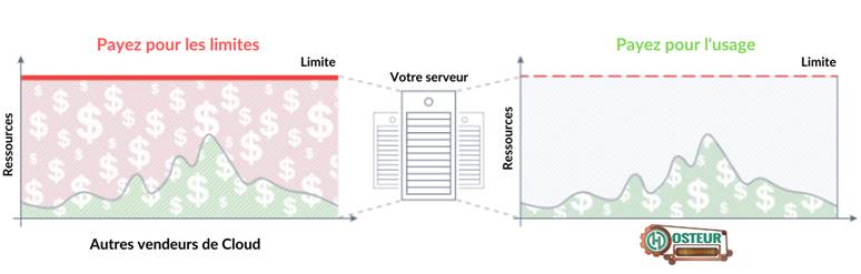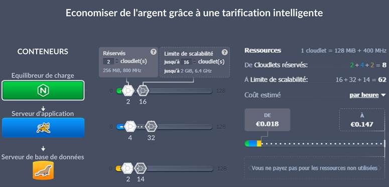 Comme l'utilisation est calculée sur une base horaire, la consommation de votre cloudlet (RAM et CPU) peut augmenter ou diminuer tout au long de la journée en fonction des besoins de l'application. Vous payez donc automatiquement un prix plus bas lorsque vous utilisez moins de ressources (par exemple pendant les périodes de faible trafic), et vous payez plus lorsque des ressources supplémentaires sont réellement nécessaires (par exemple pendant les périodes de fort trafic).