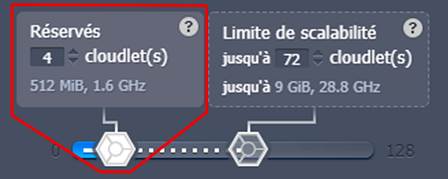 2. Réglez le curseur des Cloudlets réservés (celui qui est blanc à gauche) sur la valeur souhaitée afin d'engager la quantité minimale de RAM et de CPU dont vous pensez avoir toujours besoin et d'obtenir la réduction correspondante.