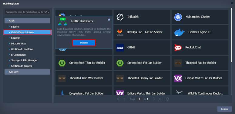 2. Dans l'onglet Apps de la Marketplace, naviguez vers la section Outils dév et admin pour localiser le package Traffic Distributor (ou utilisez simplement le champ de recherche en haut) et cliquez sur le bouton Installer.