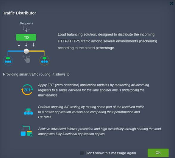 Après l'installation du Traffic Distributor, vous aurez un environnement dédié avec le(s) équilibreur(s) de charge NGINX et un add-on spécial inclus. Cela garantit une possibilité de reconfiguration rapide et simple de cette solution et donne accès à quelques options supplémentaires :